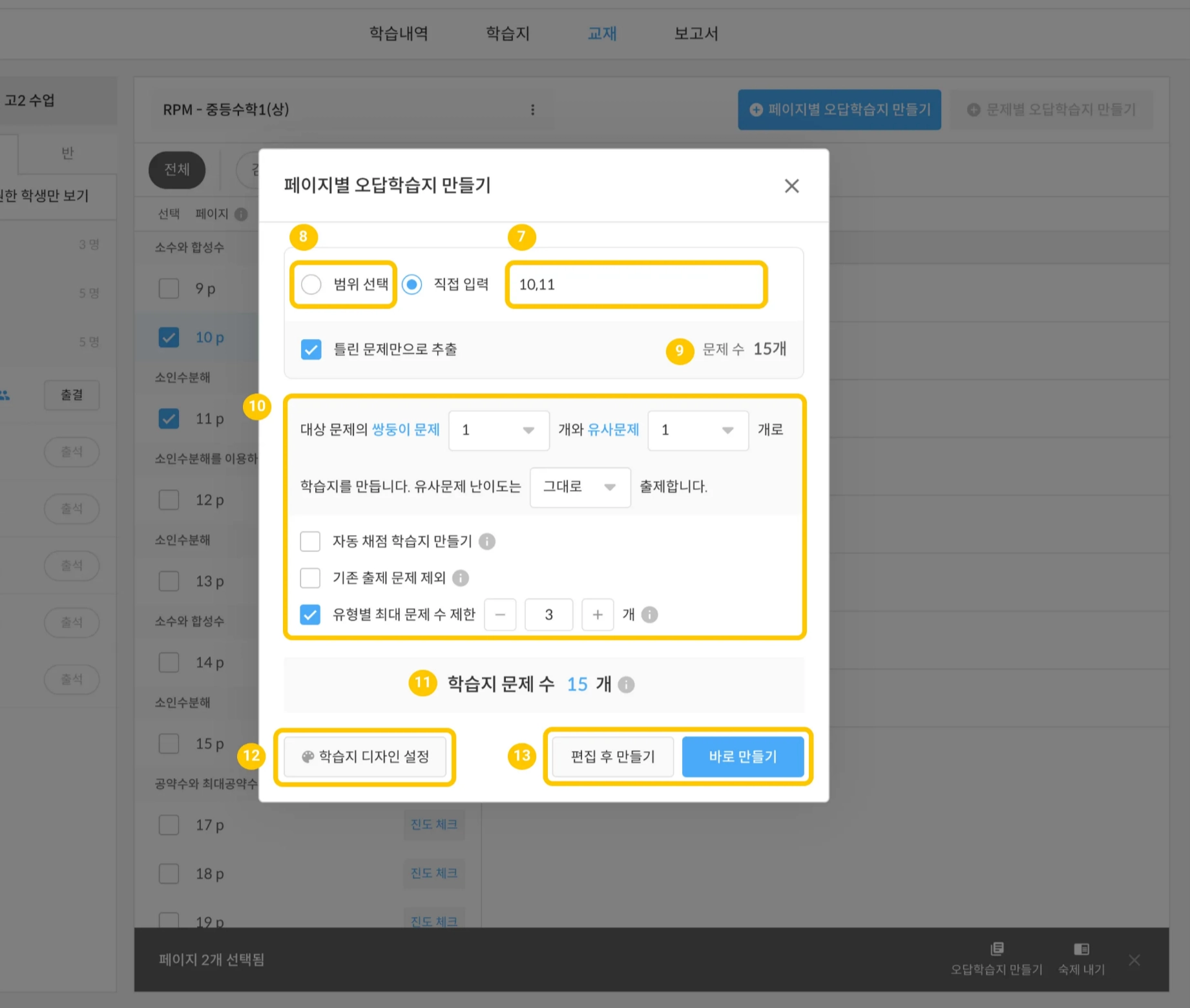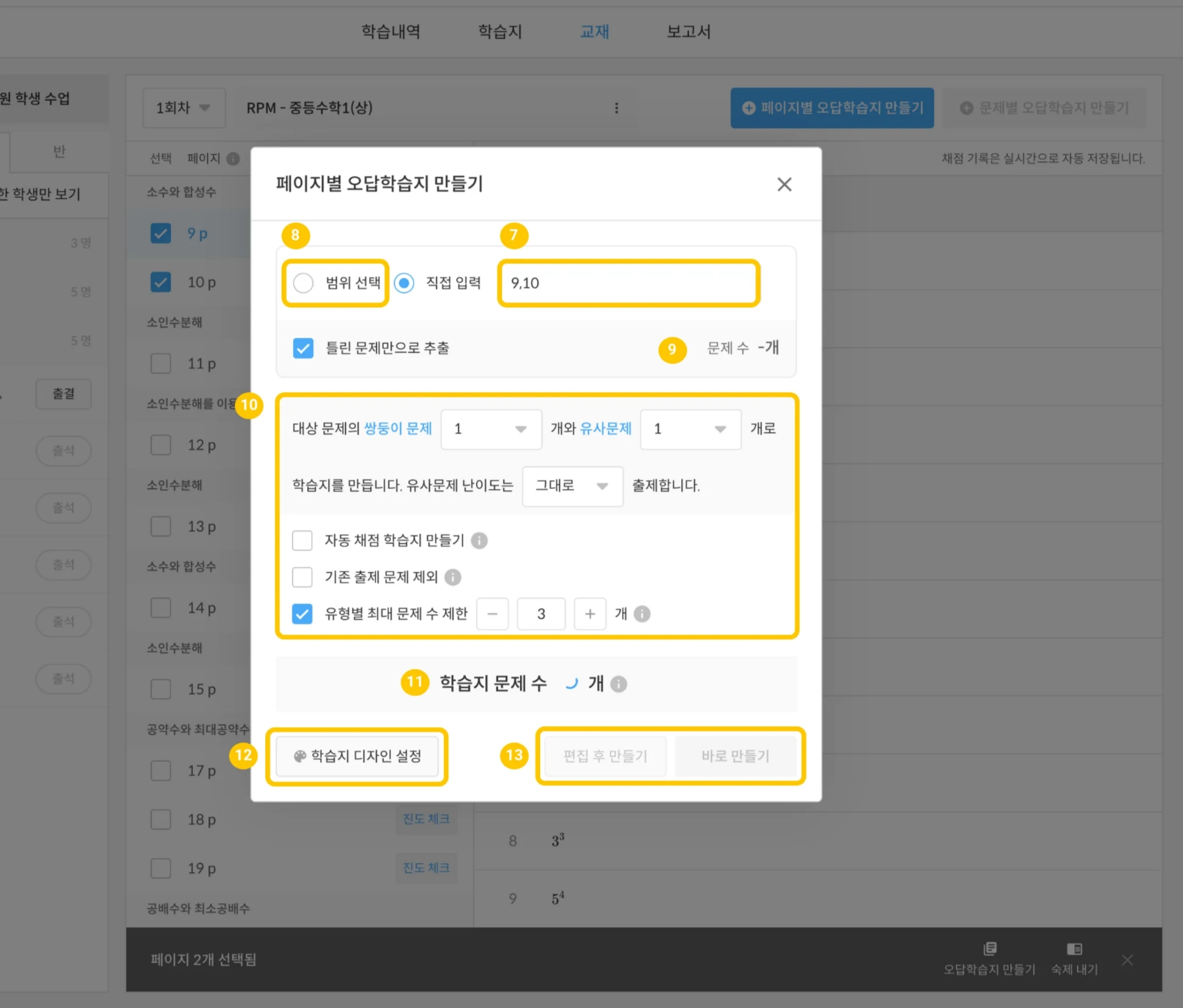 오답학습지를 만들 페이지를 체크합니다.