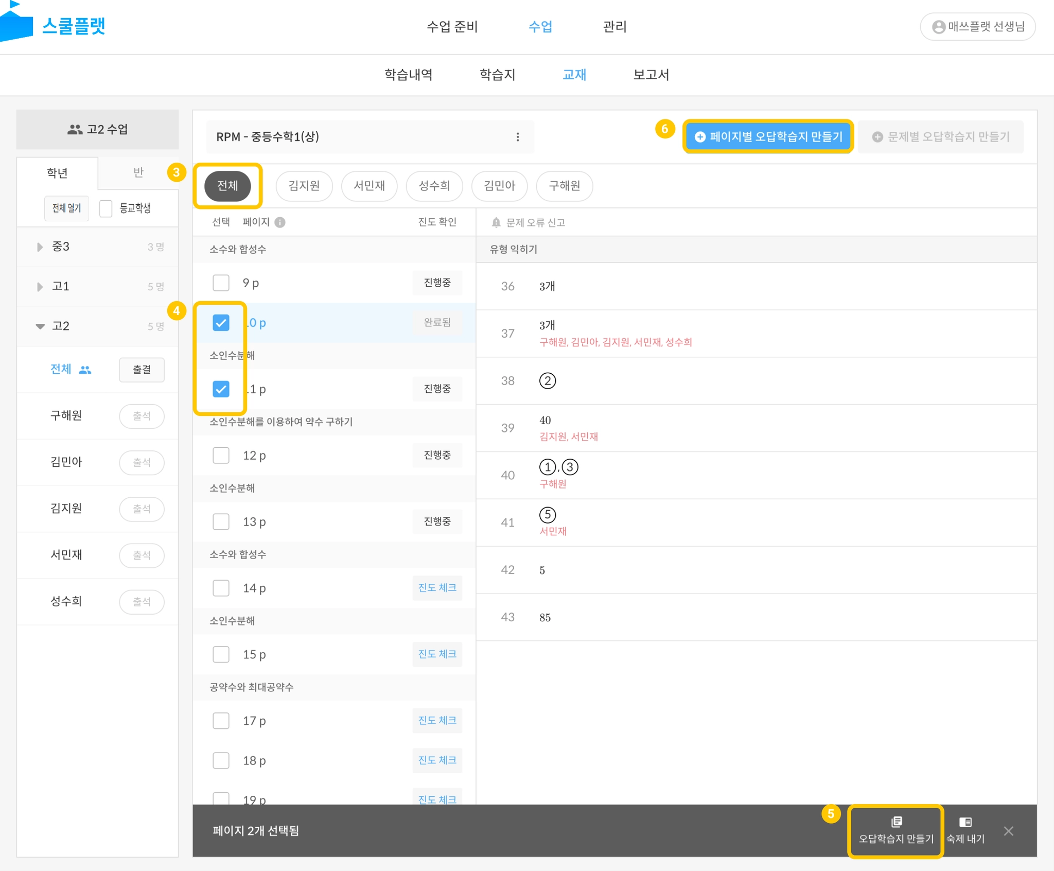 학년 및 반 페이지별 오답학습지 만들기