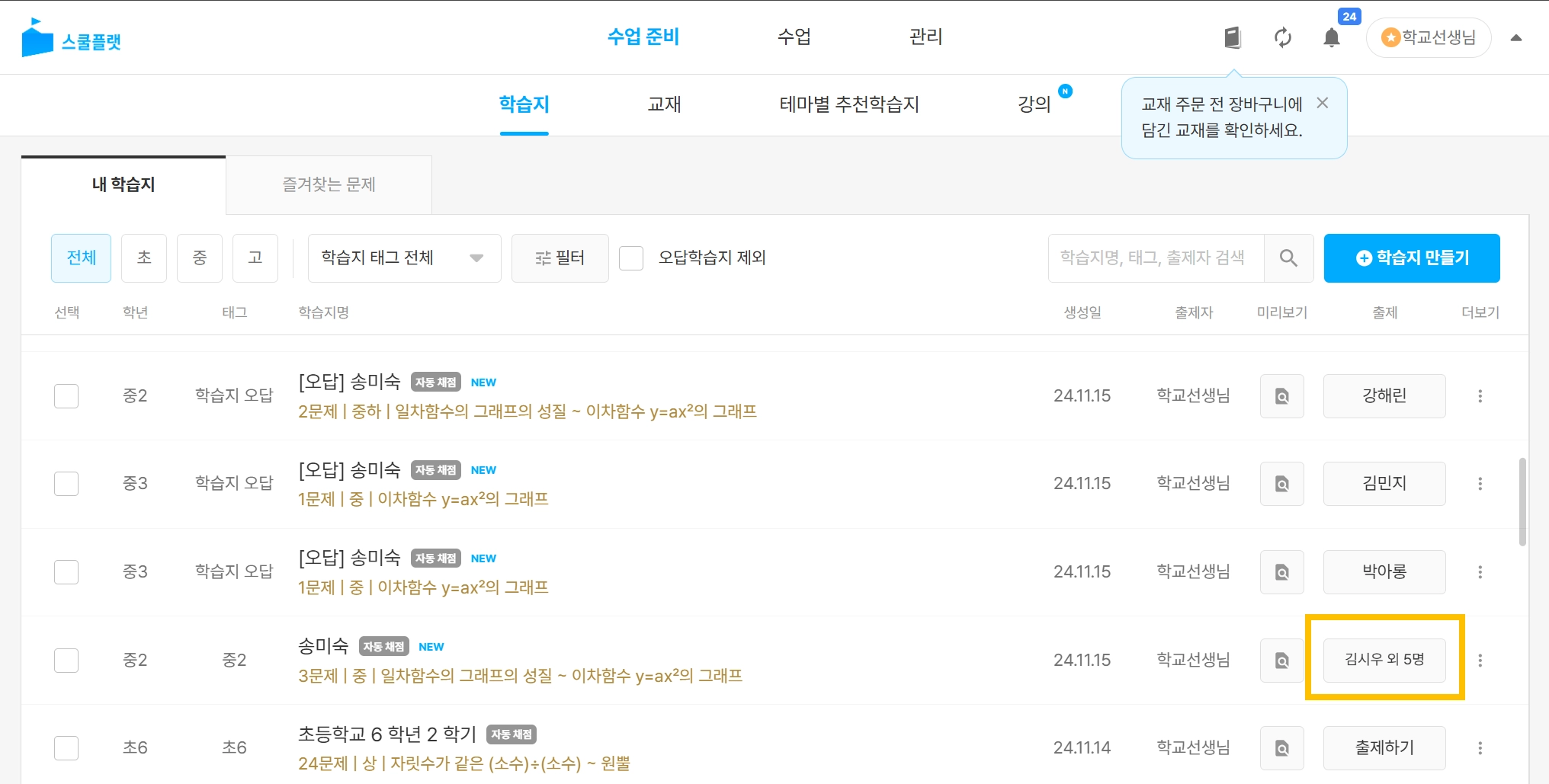 학습지나 교재를 채점하기 위해서는 우선 학생에게 출제를 해야합니다. 출제를 한 뒤 [수업] 탭으로 이동하여 학습지와 교재를 채점해보세요.