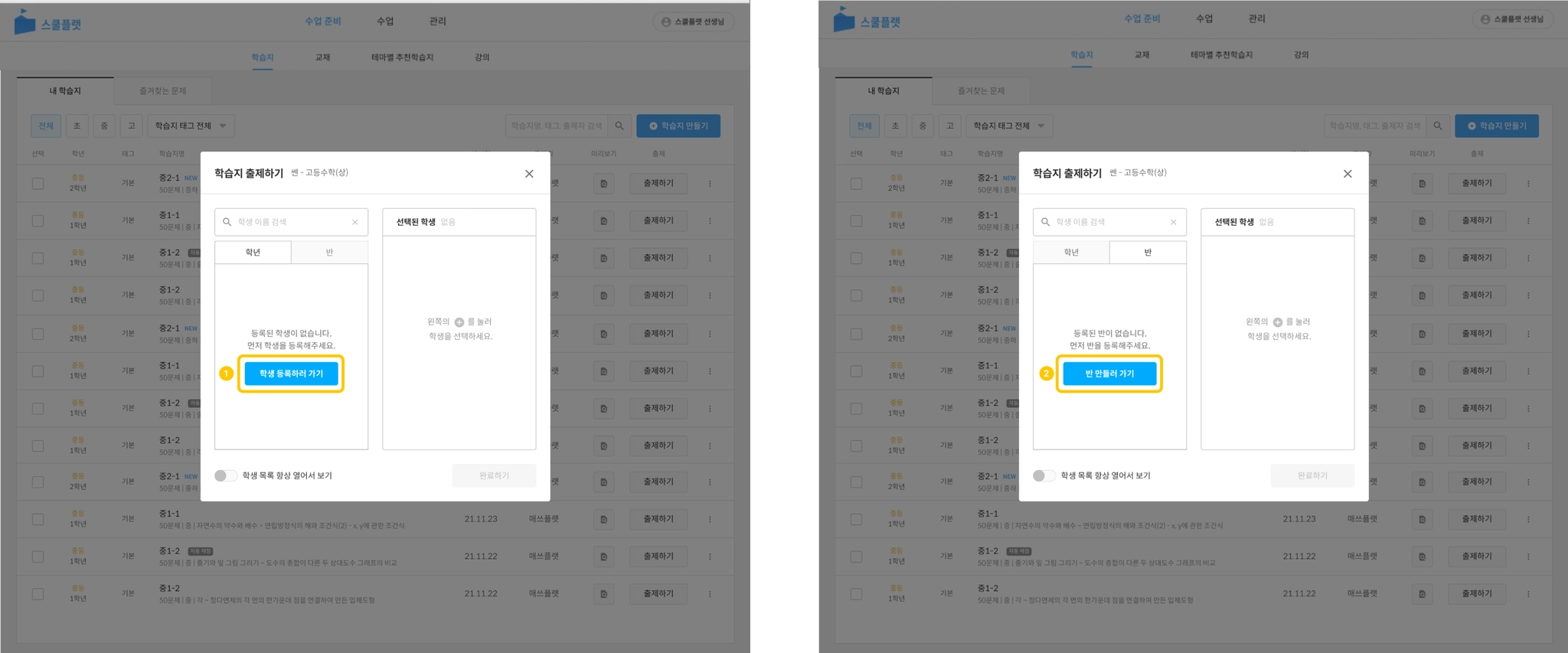 출제하기 버튼을 눌러 학생에게 학습지를 출제할 수 있습니다.