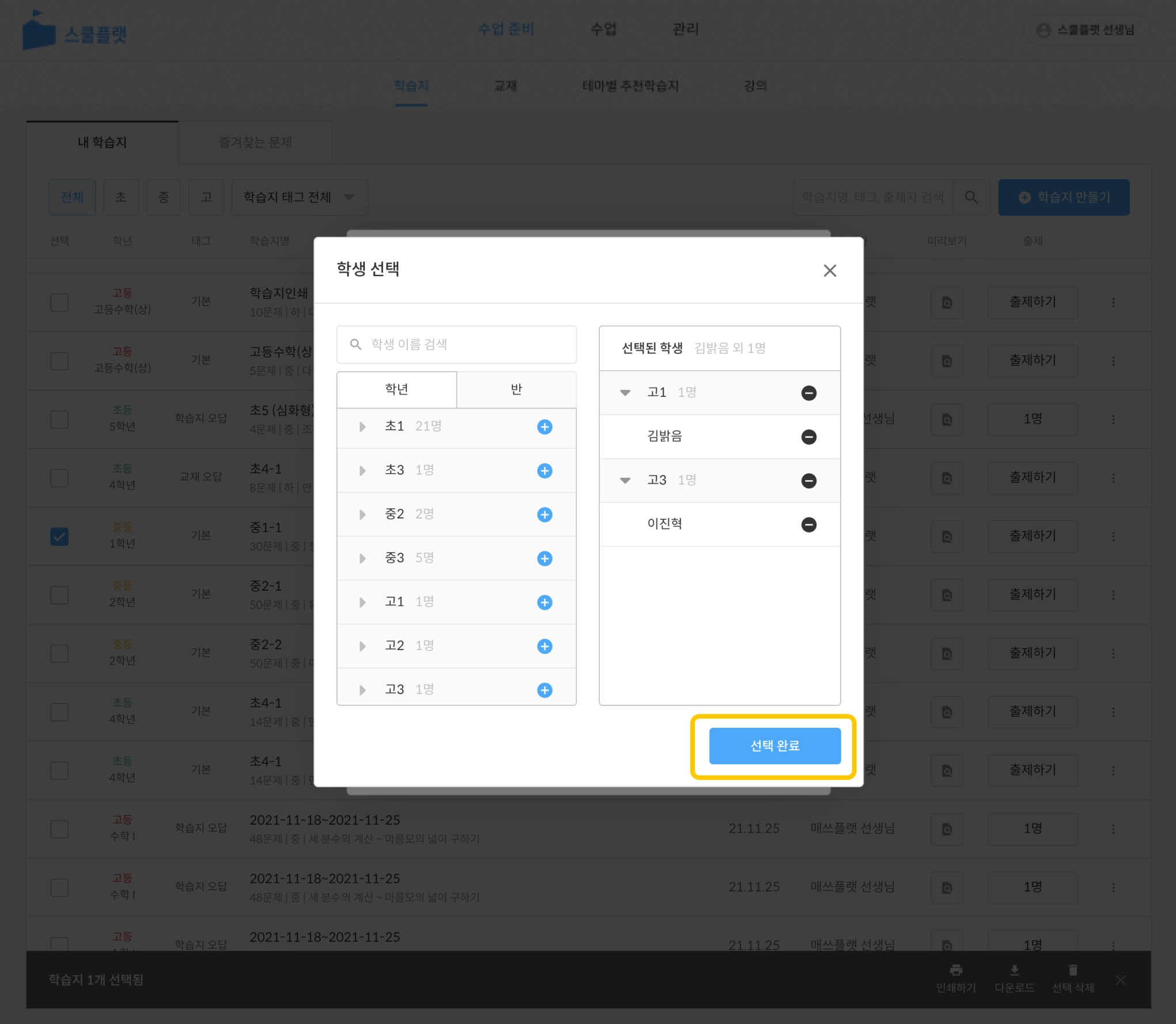 학생을 모두 추가했다면 선택 완료를 누릅니다.