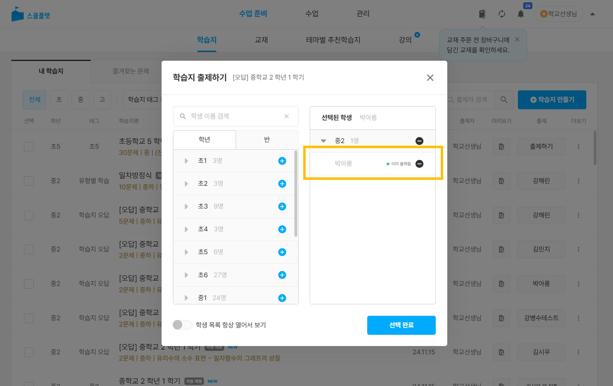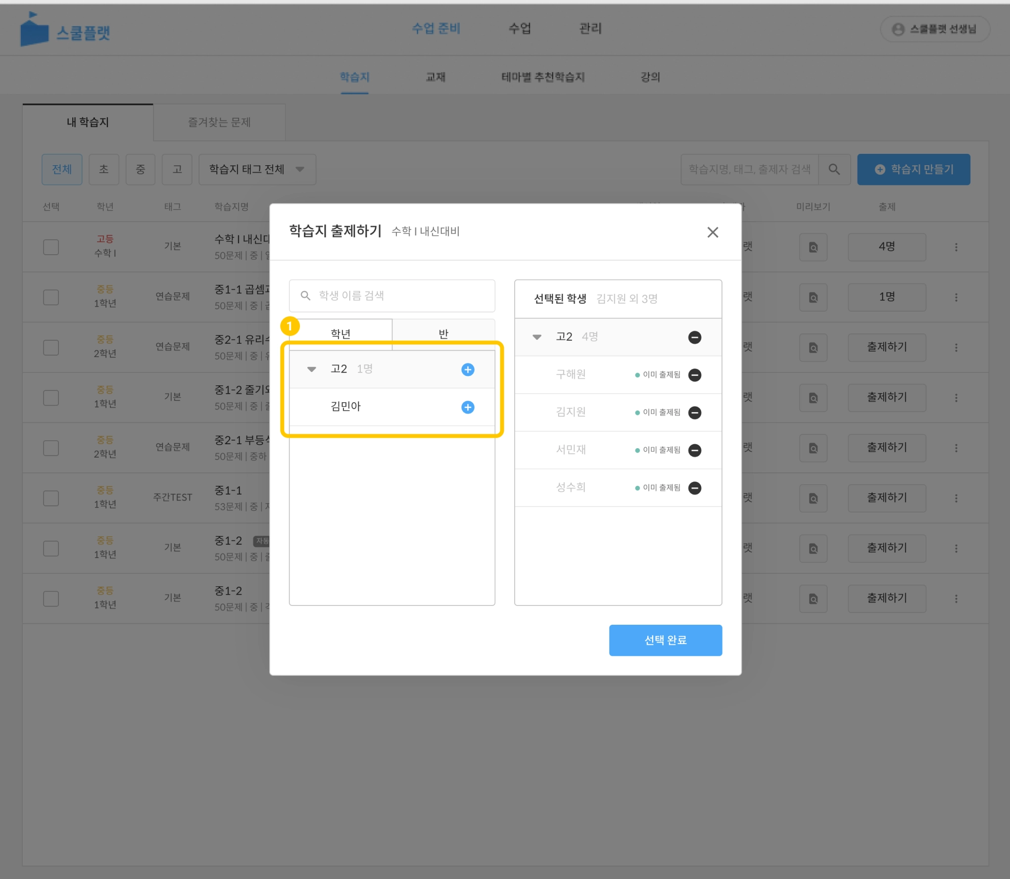 학생을 모두 추가했다면 선택 완료를 눌러 출제를 마칩니다.