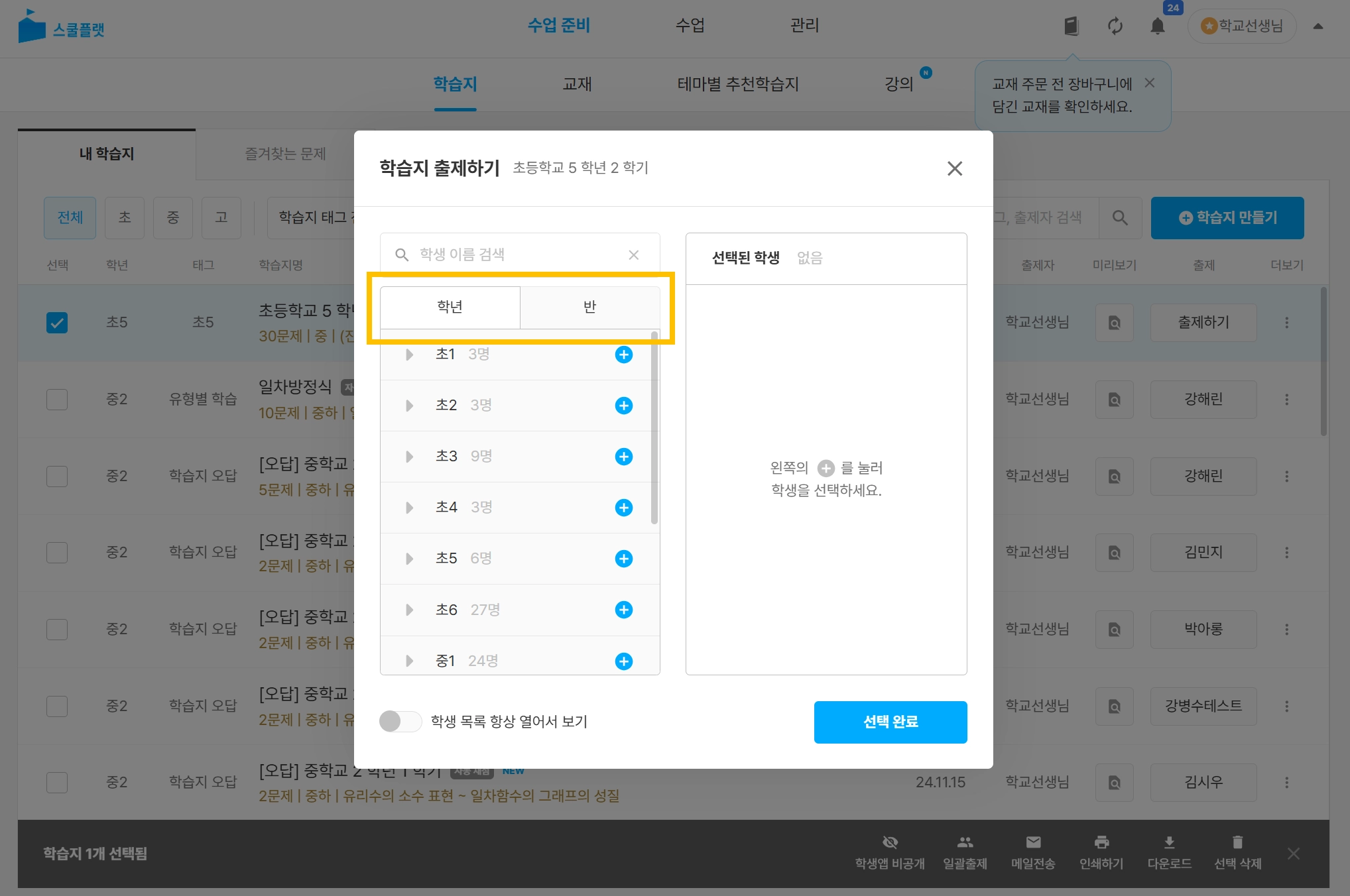 학년탭을 선택하면 학년별로 원하는 학생에게 출제할 수 있습니다.