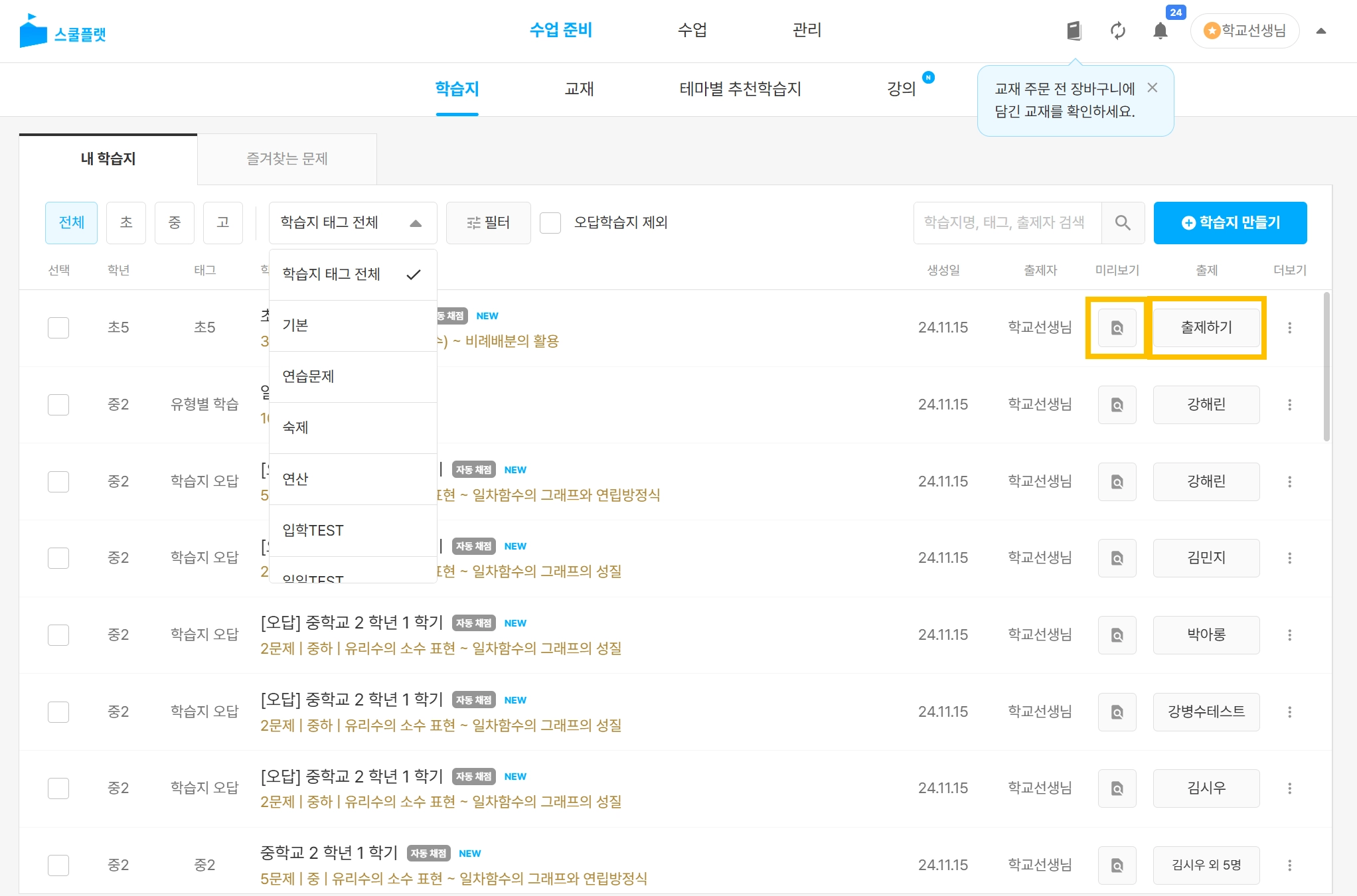 수업준비 → 내학습지 전체 목록으로 진입합니다.