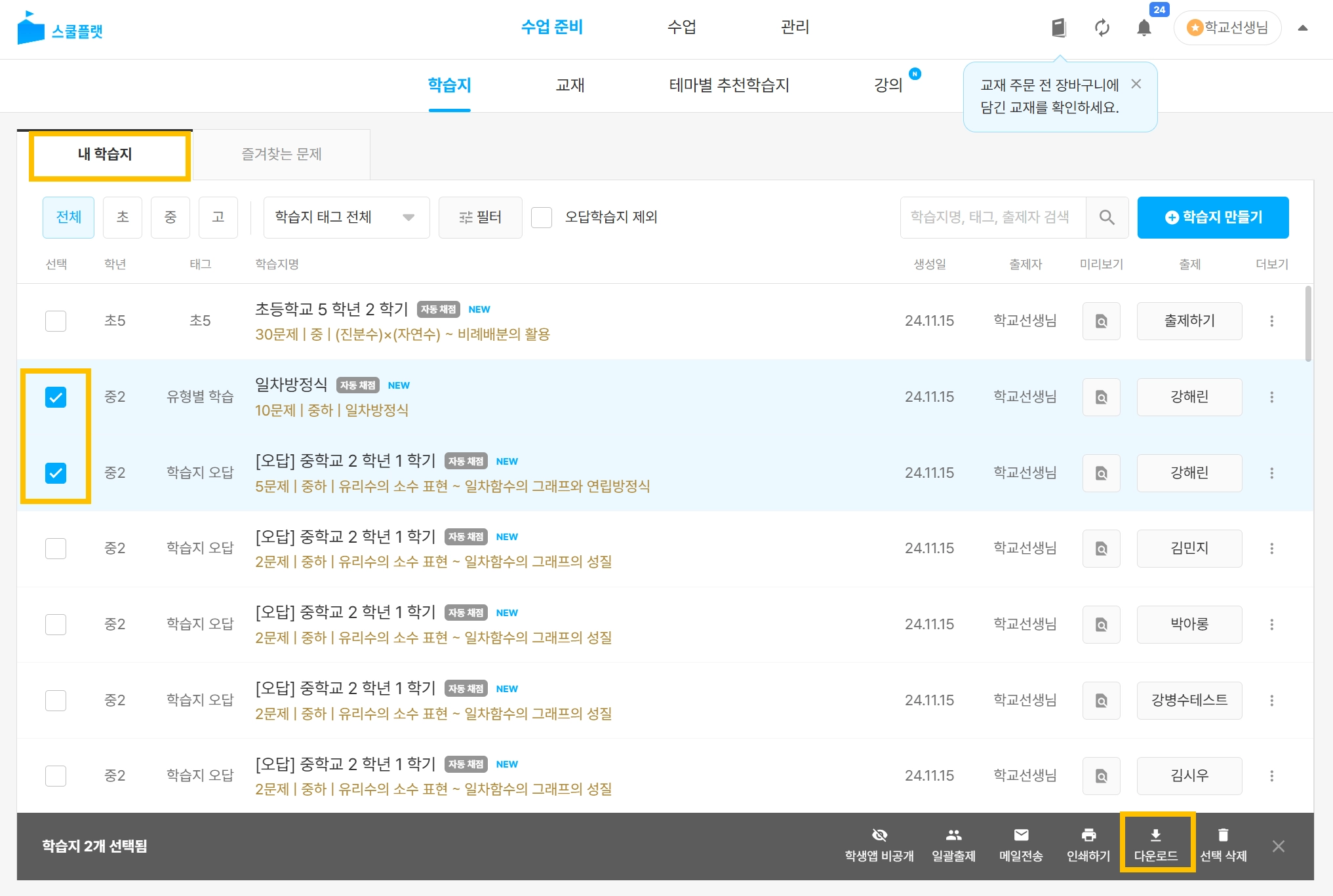 학습지 목록 중 다운로드 할 학습지를 선택합니다.(복수 선택 가능)