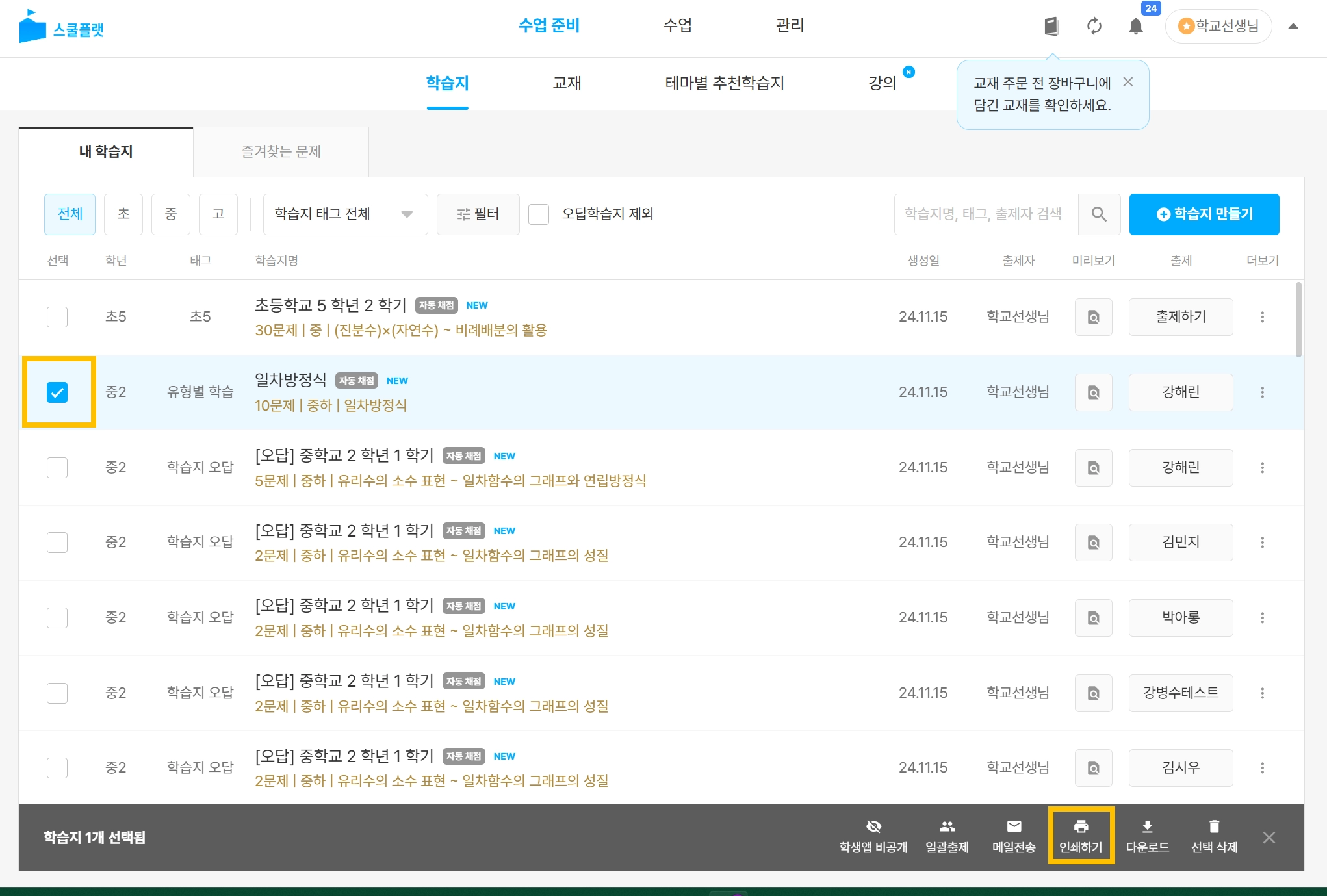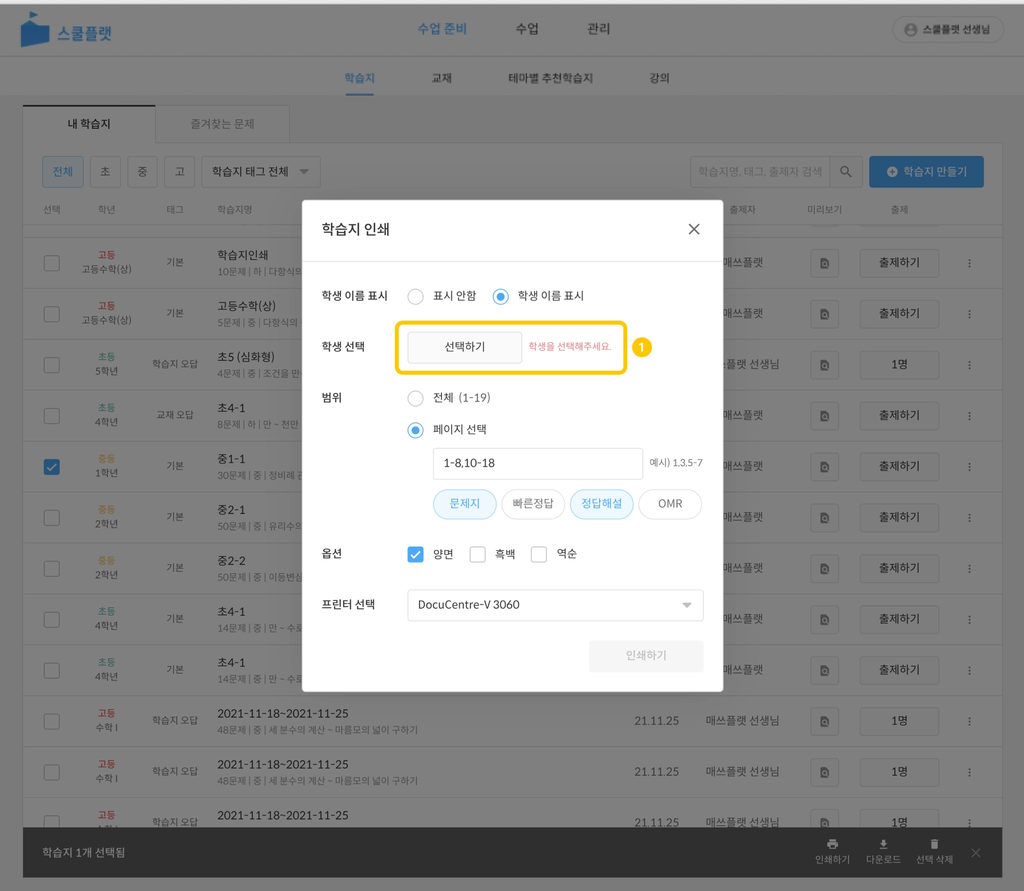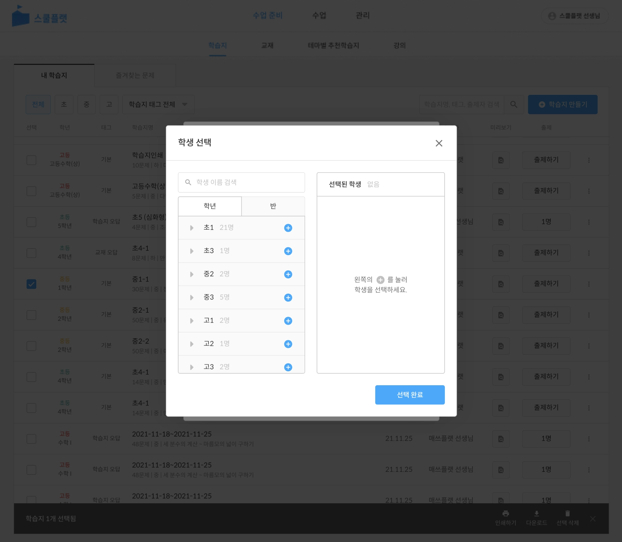 학습지 목록 중 인쇄할 학습지를 선택합니다. (복수 선택 가능)