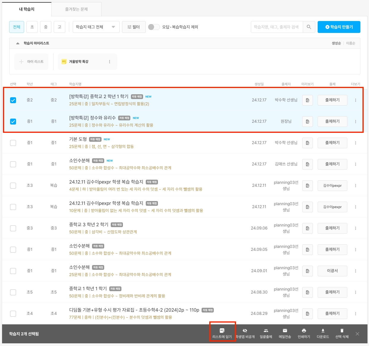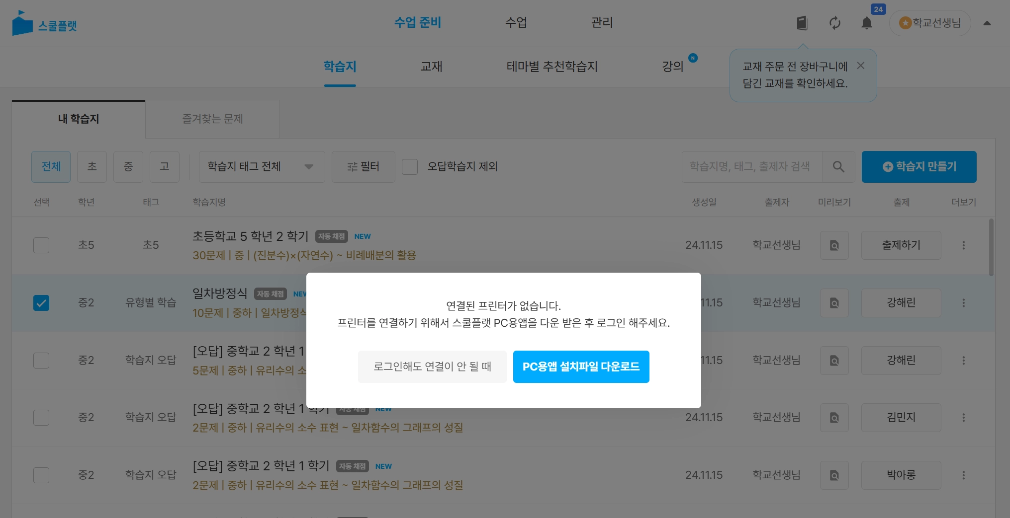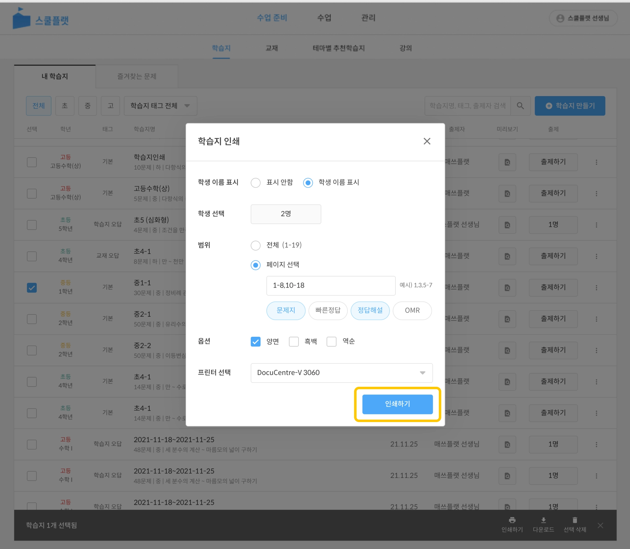 학습지 목록 중 인쇄할 학습지를 선택합니다. (복수 선택 가능)