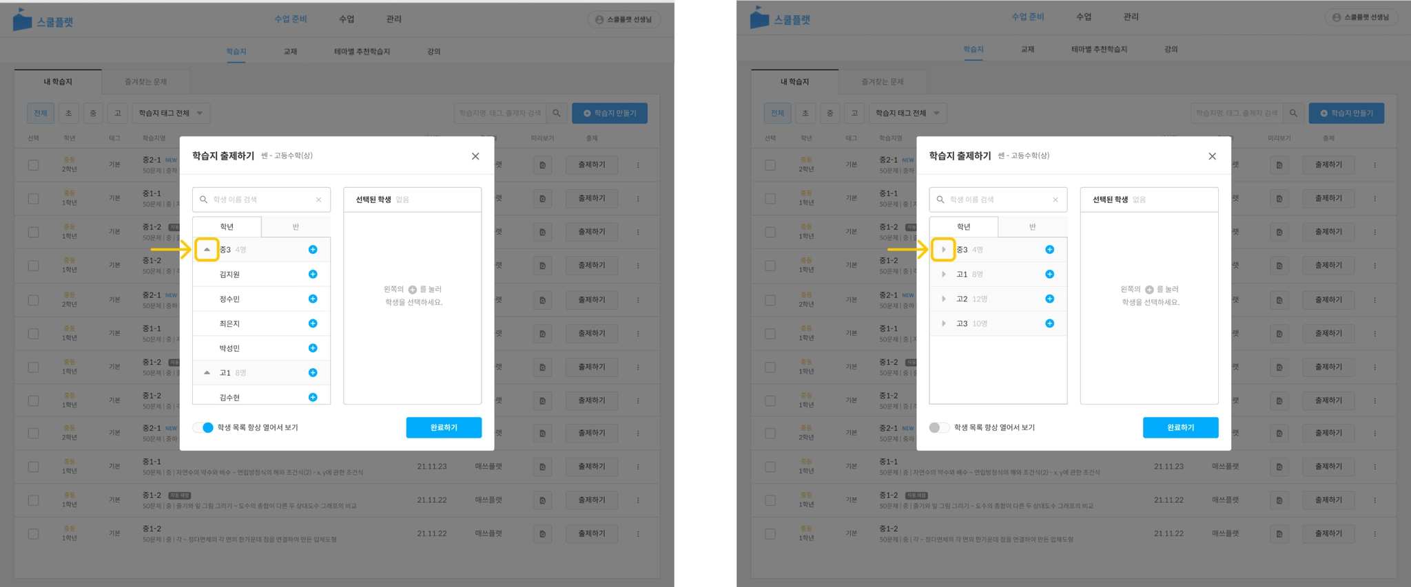 화살표를 눌러서 학생 목록을 열어보세요.