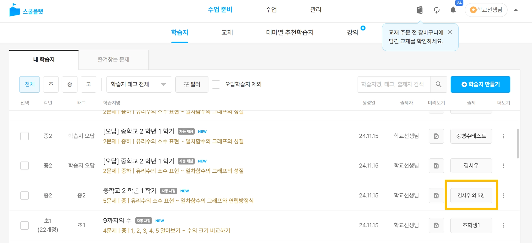 [수업 준비] - [학습지] - [내 학습지]에서 만든 학습지 목록을 확인할 수 있습니다.