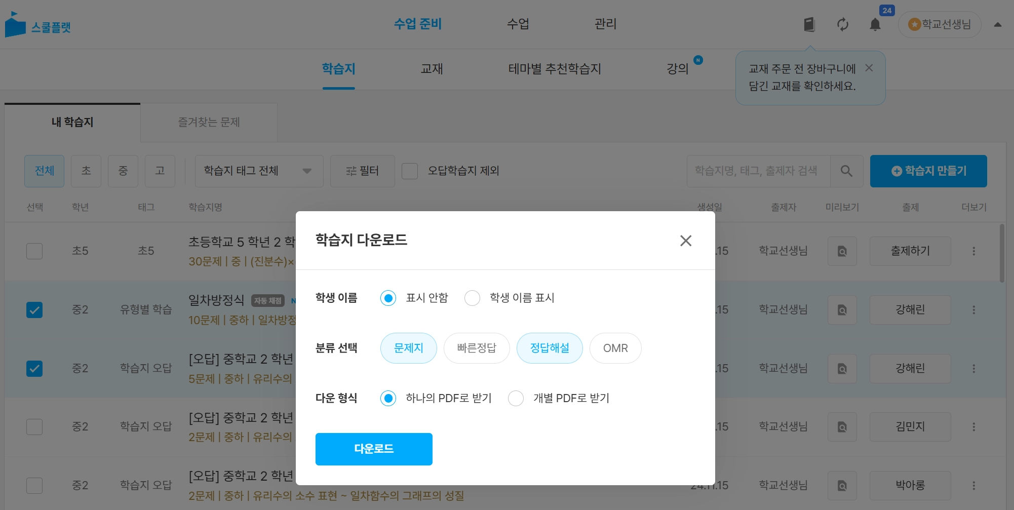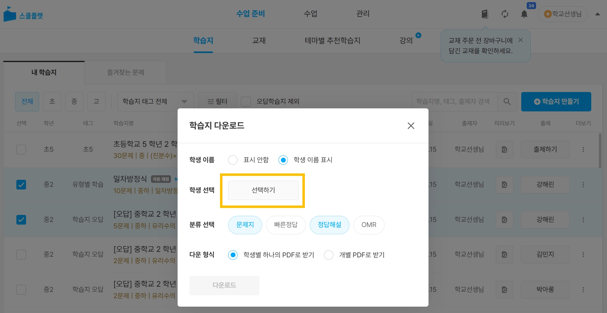 학생 선택을 완료 후, 다운로드 버튼을 누르면 학습지가 다운로드됩니다.