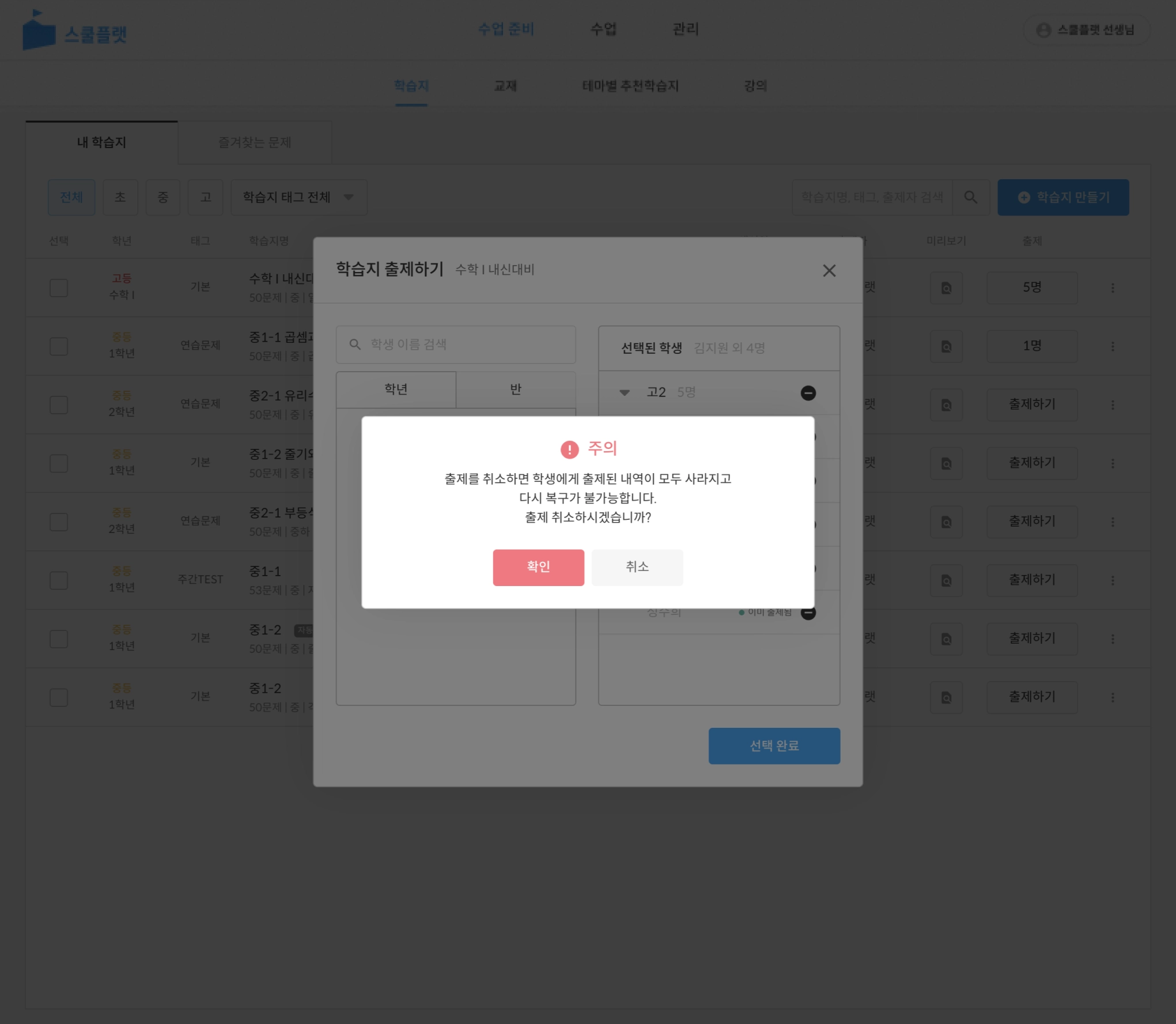 학습지 출제 취소하기