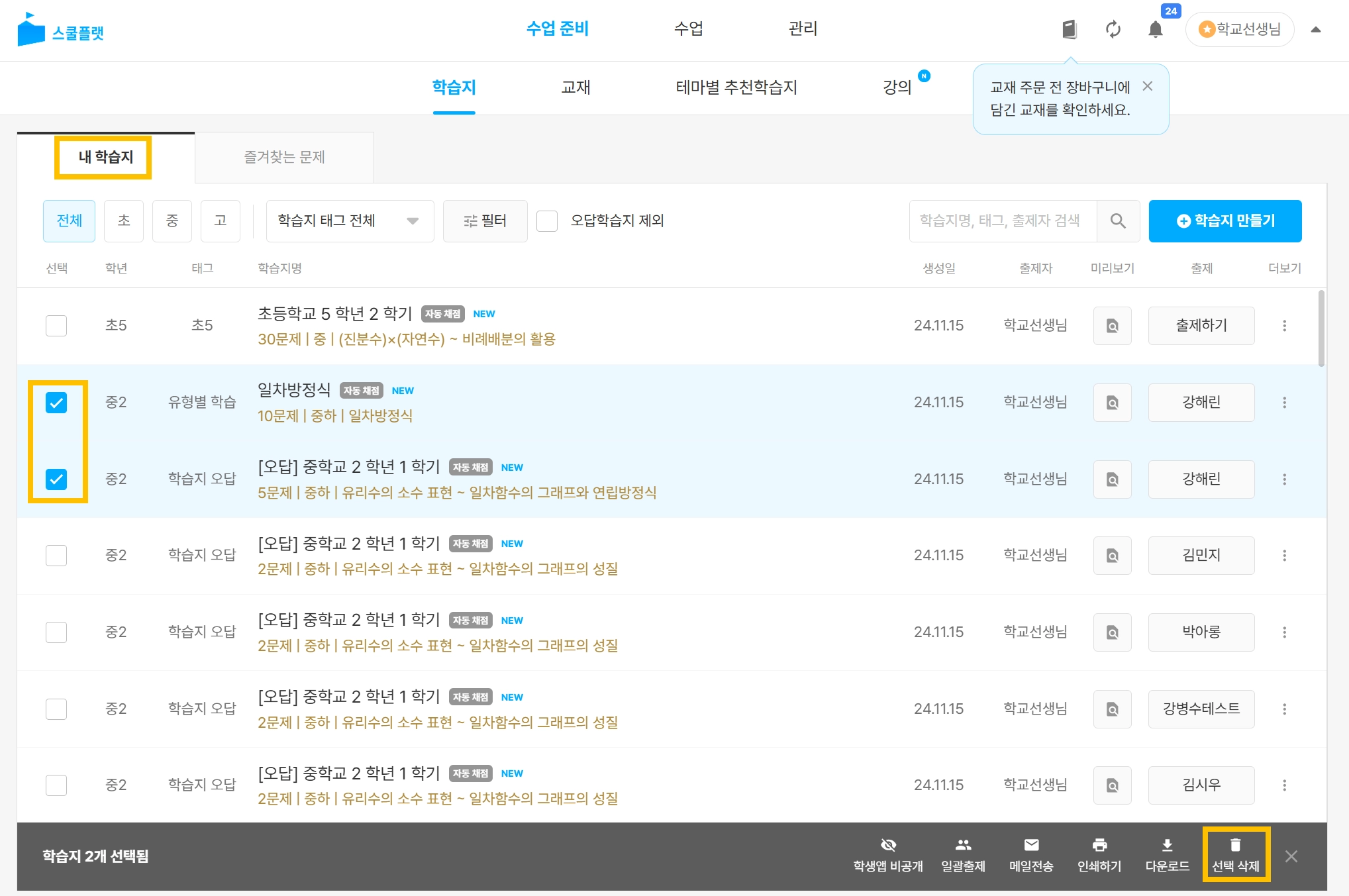 학습지 목록 중 삭제 할 학습지를 선택합니다.(복수 선택 가능)