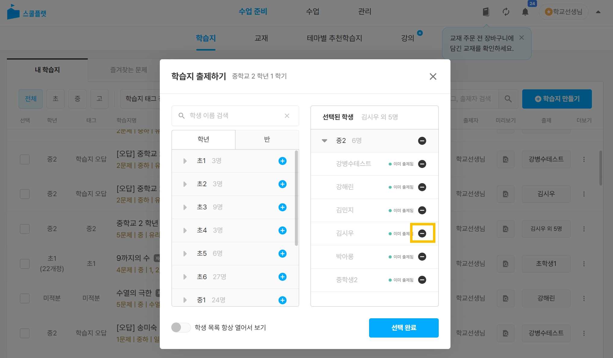 오른쪽 열에서 출제를 취소하고 싶은 학생 이름 옆의 - 아이콘을 누릅니다.