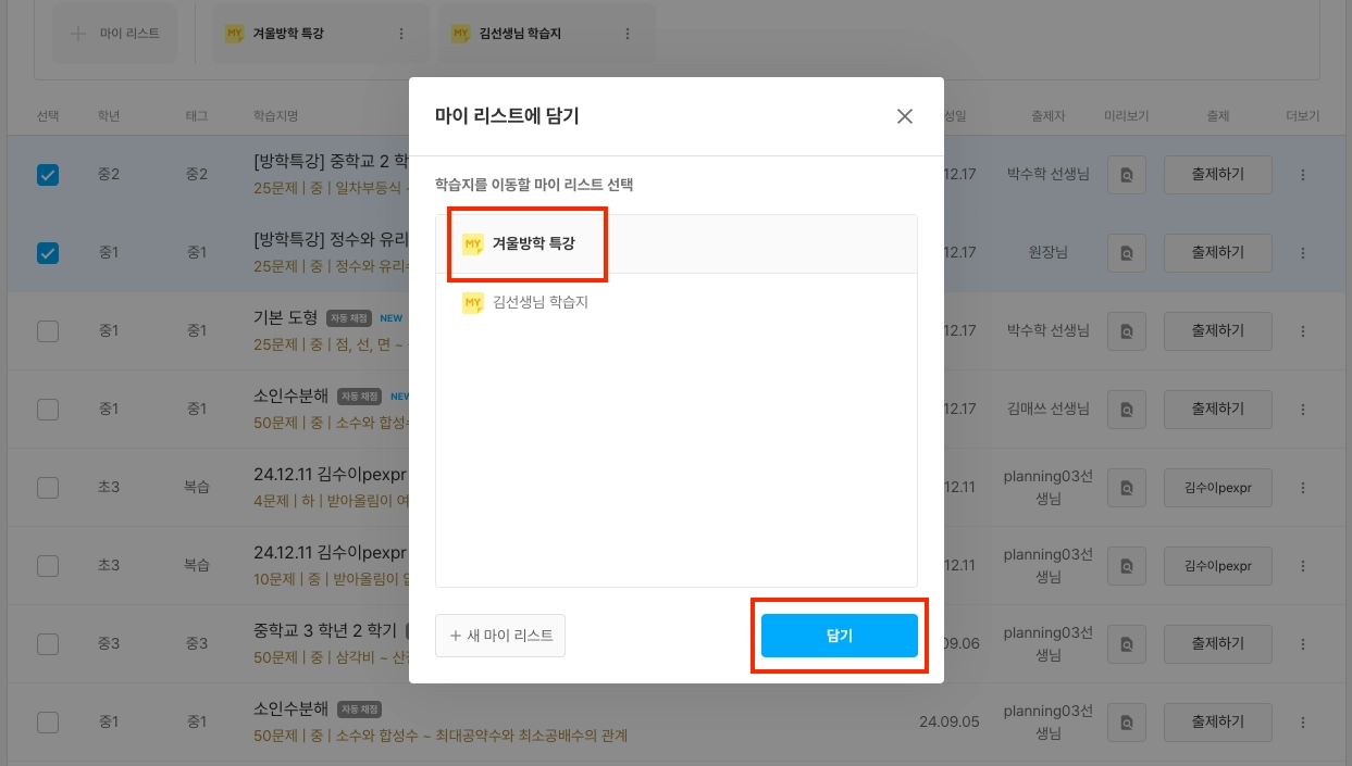 선택한 학습지를 담을 마이 리스트를 선택한 후 ‘담기’를 누릅니다.