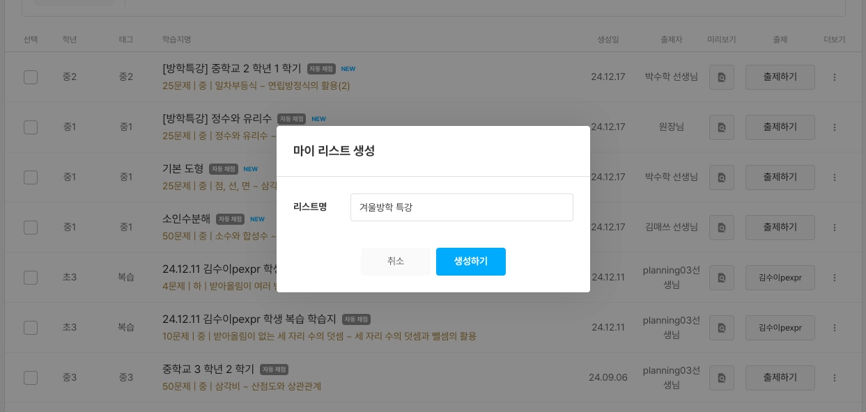 내 학습지 목록에서 출제하기 버튼을 누르면 학습지 출제하기 창이 뜹니다.