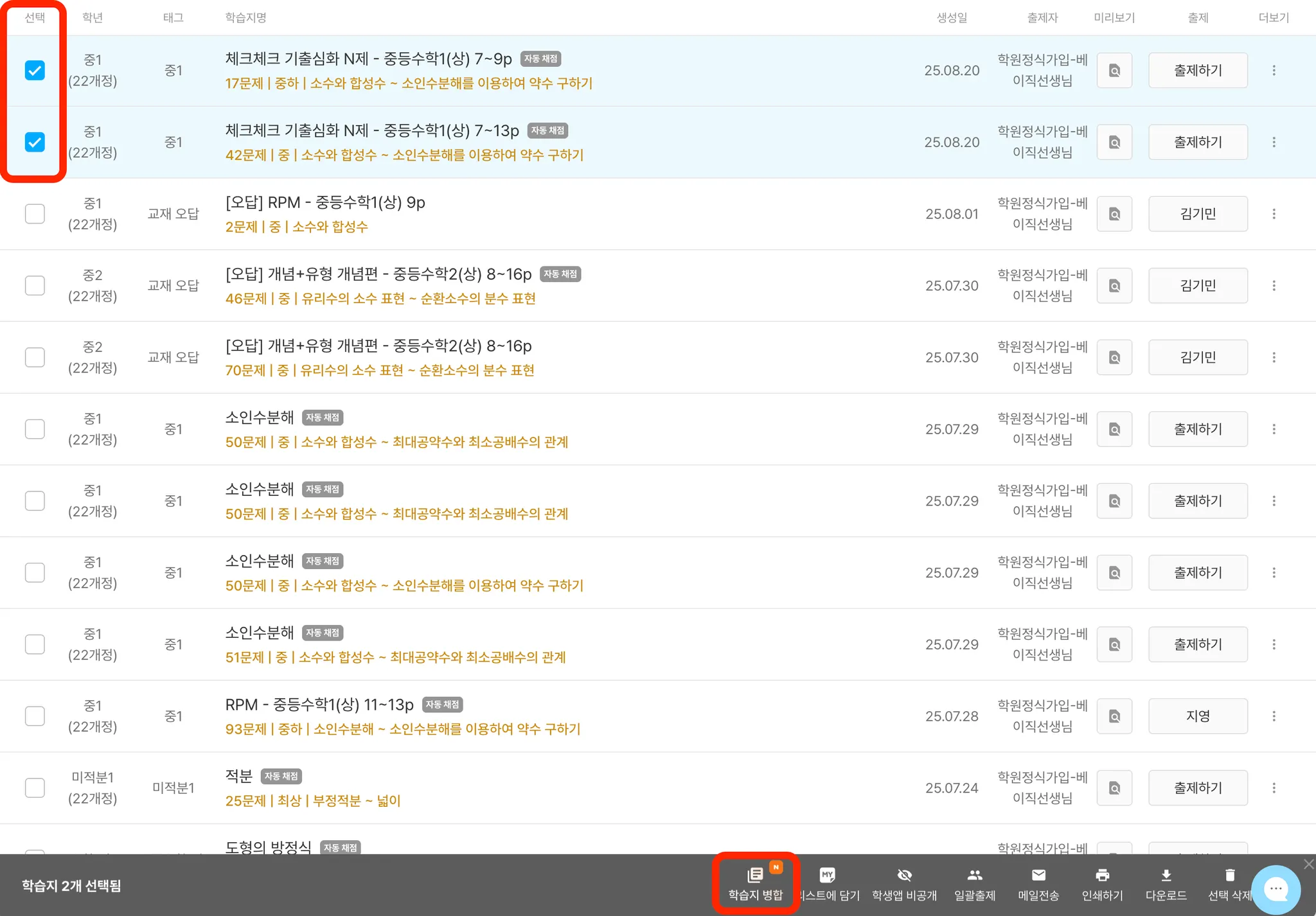 2개 이상 선택하시면 하단의 학습지 병합 버튼이 노출됩니다.