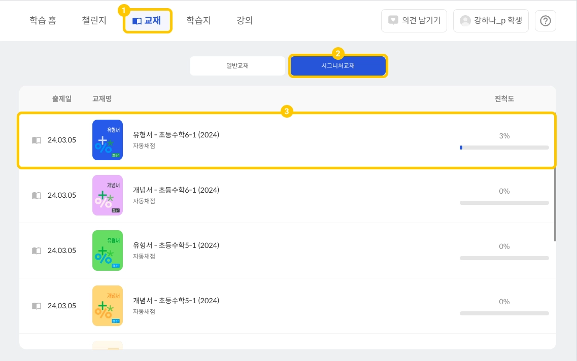 원하는 시그니처 교재를 선택하여 e북으로 학습할 수 있습니다.
