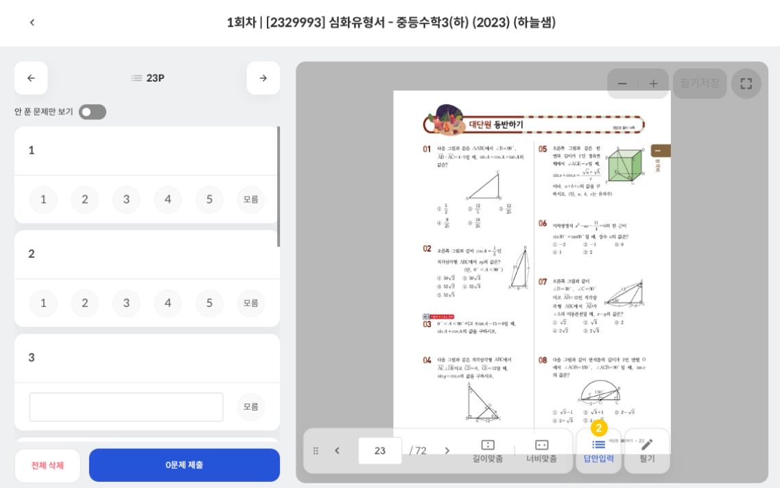 답안입력 버튼을 눌러서 답을 입력하는 창을 띄울 수 있습니다.