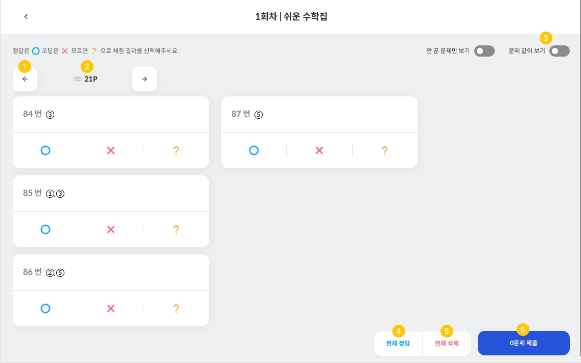 [관리] - [운영 관리] - [학생앱 관리]에서 채점 전 정답 공개와 채점 후 정답 및 해설 공개 여부를 설정할 수 있습니다. 정답을 비공개하면 학습지와 교재의 정답이 모두 비공개됩니다.