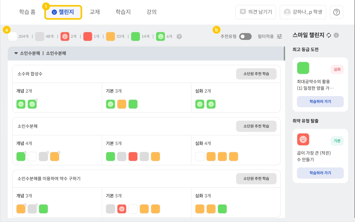 학년 학기에서 학습할 유형의 성취도 난이도를 상단에서 확인할 수 있습니다.