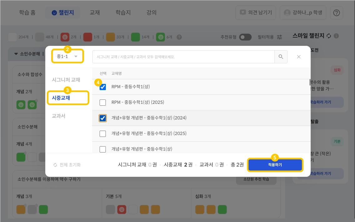 원하는 교재(또는 교과서)를 선택하여 필터에 ✓합니다.
