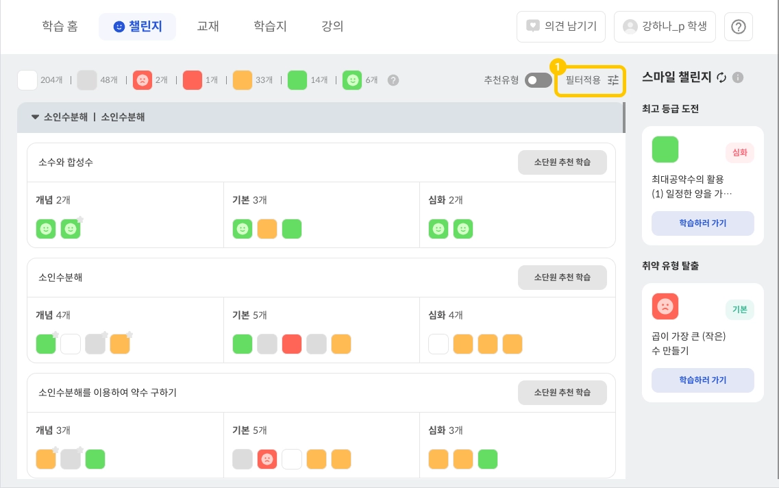 필터 적용 버튼을 선택하고 학습 필터 팝업을 띄웁니다.